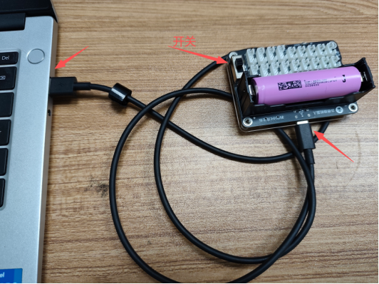 如下图,将小E板与电脑连接如下,并拨动开关到ON位置: