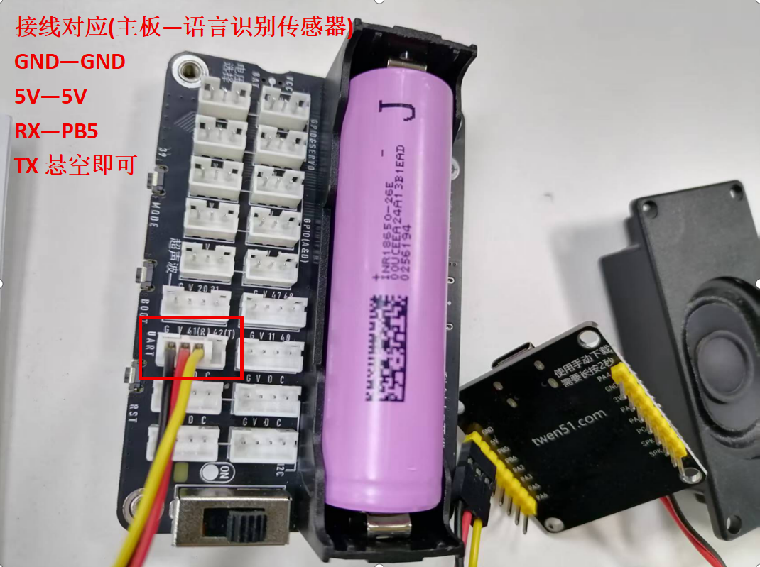 - 使用舵机时,并务必接到小E板的舵机区接口,并将旁边的开关拨动到BAT。