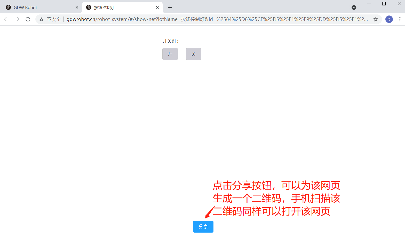 生成的新网页如下图。网页中会有一个按钮可以用来点击。 点击分享按钮,会打开一个二维码,手机扫码该二维码,手机上也能打开该网页。