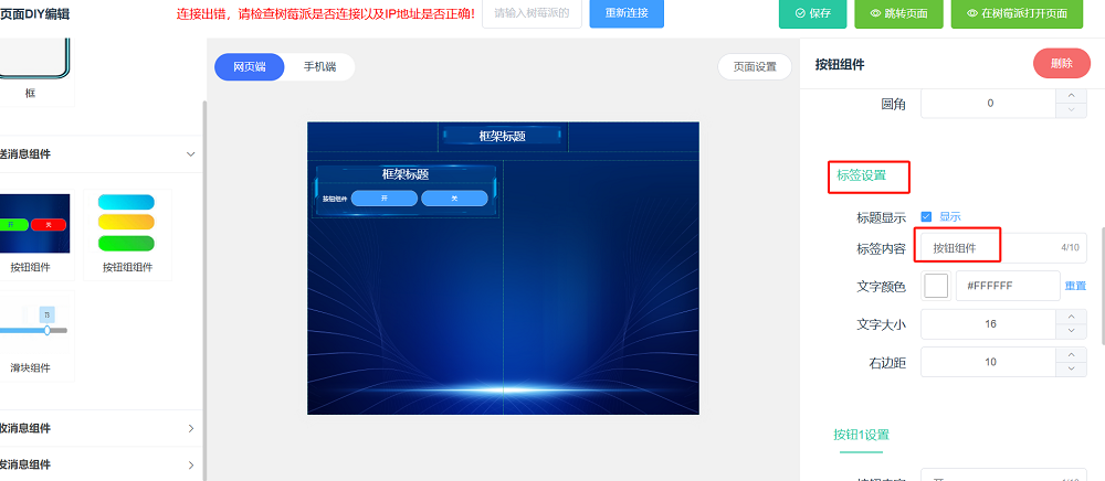 如果第一步的连接设备没有成功,会出现下图的红色字样提示连接错误。这个错误提示不影响自定义页面的编辑和创建,只是在点击页面右上角的在树莓派打开页面按钮将页面在树莓派上打开时会失败。