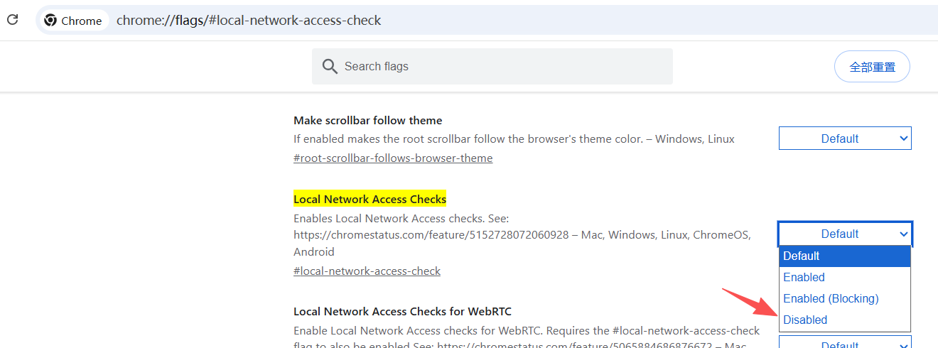 chrome浏览器升级到147版本后,增加了一个实验的特性,对局域网的访问做了限制。可以通过下面的方法解决。 在chrome的地址栏里输入chrome://flags/#local-network-access-check打开,如下图然后改为