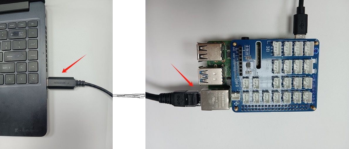 将USB转网口线的USB端插入到电脑的USB口,网线头插入树莓派的网口,如下图然后给树莓派上电。