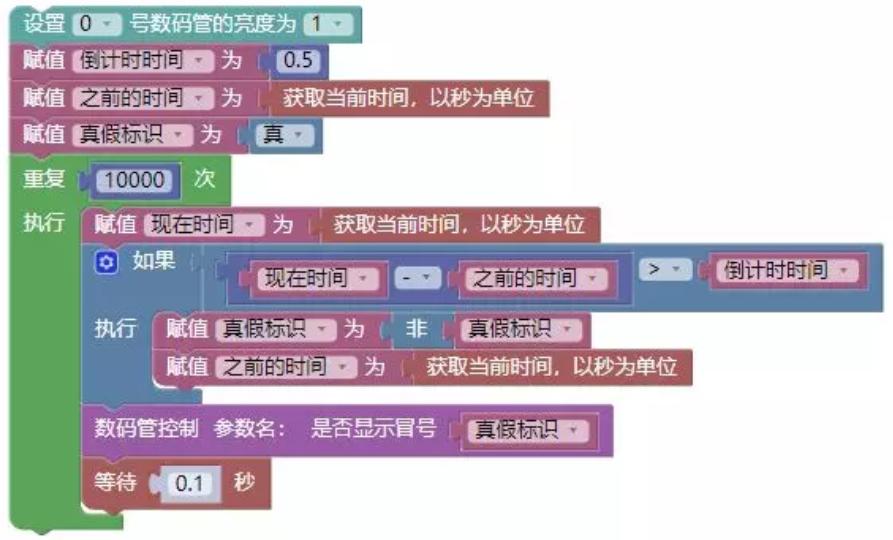 - 冒号的显示周期是1秒,可以一秒为一个功能块通过判断是前半段还是后半段控制冒号显示,也可以像本例一样通过以0.5秒为倒计时触发软件开关。